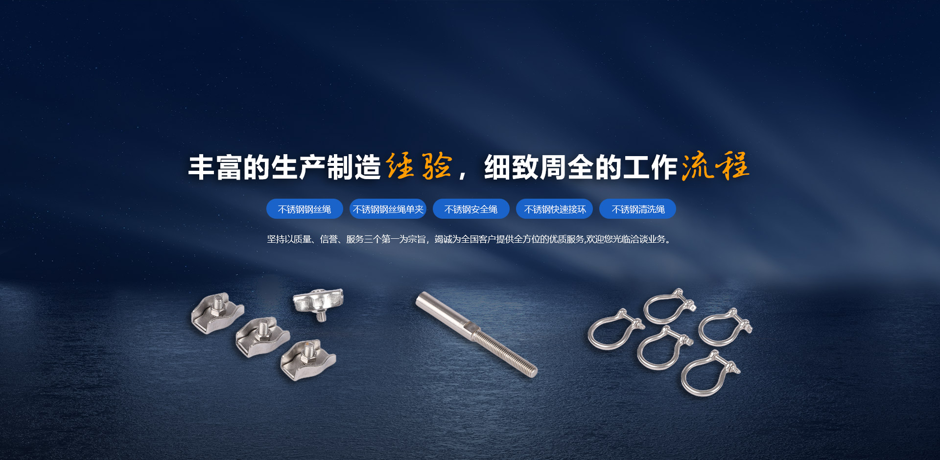 我公司生產不銹鋼鋼絲繩,鋼絲繩配件,不銹鋼索具配件等,是一家集研發、生產、銷售、售后為一體的綜合性企業。